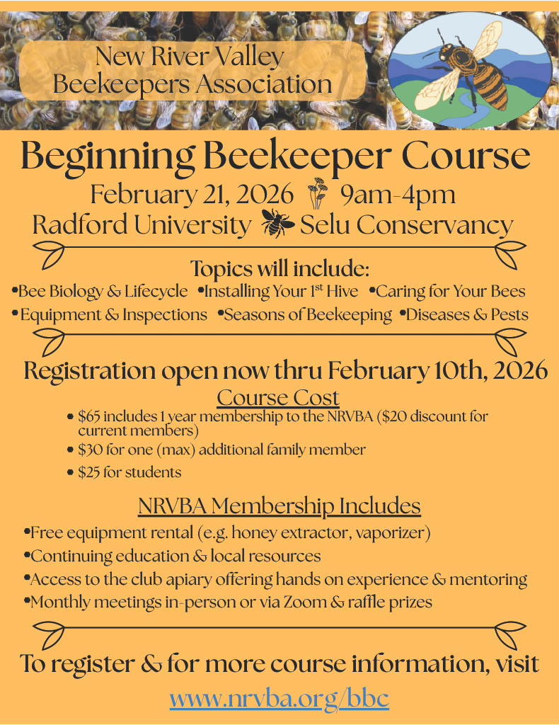 We are pleased to offer our 2025 Beginner’s Beekeeping Course. Check out https://nrvba.org/bbc for the latest info! Please note that the last day to register is February 7. The class will be held on February 15.